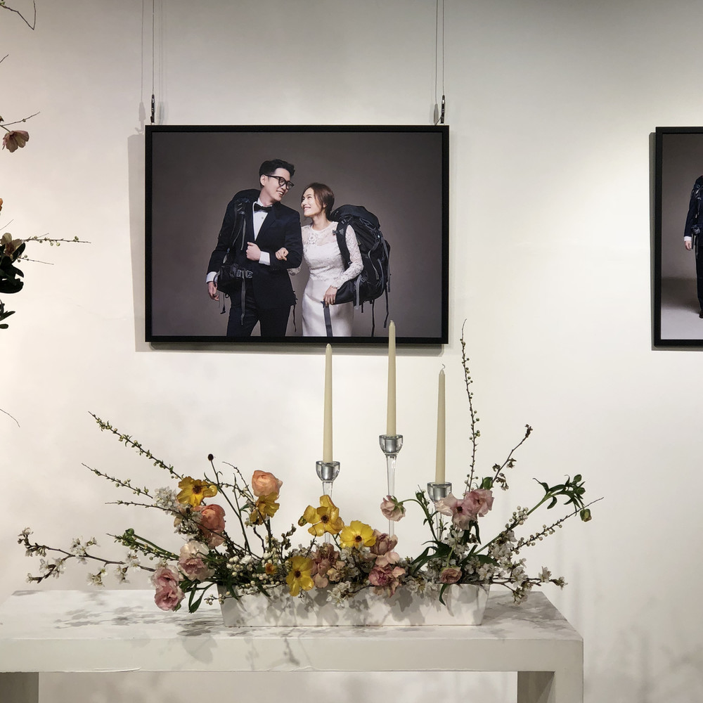 가족, 친구를 초대하여 치루는 단 하루의 시간 동안, 신랑신부님이 만나며 보낸 계절 속에서 둘의 모습을 직접 사진으로 담고. 액자로 전시하여 사진마다 신랑님이 직접 코멘트를 달아 전시했던 작은 결혼식 이야기입니다. 결혼사진전과 함께 연출된 꽃도 하나의 전시공간처럼 보일 수 있는 연출을 제안드렸습니다.
