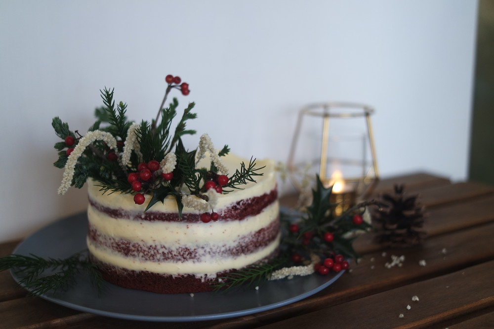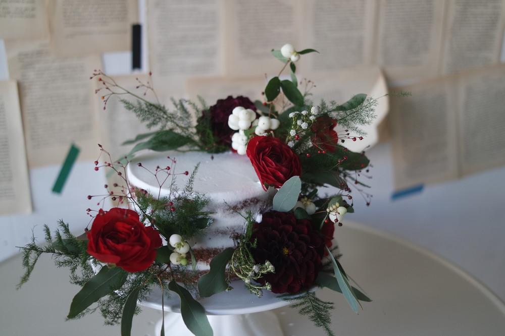 사진은 레드벨벳 케이크에 크리스마스 분위기의 꽃장식을 더 한 모습입니다.