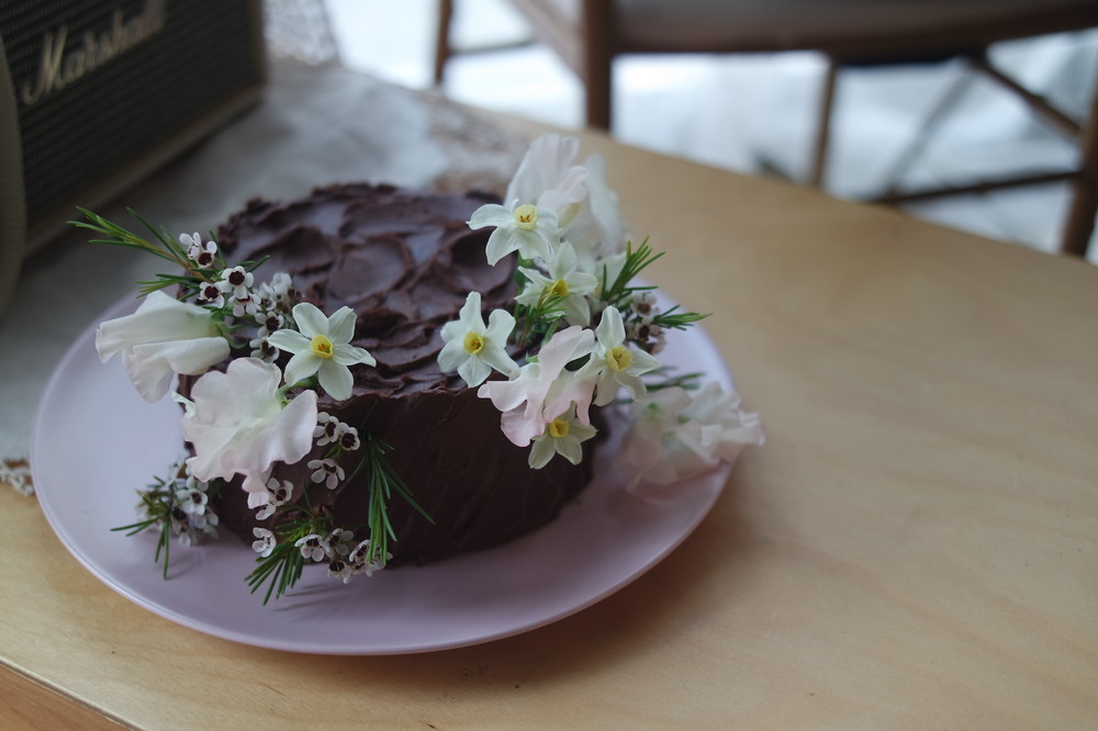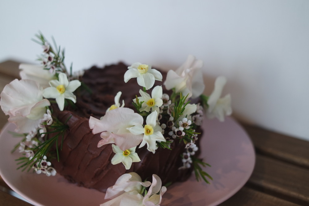 사진은 마틸다쵸코 케이크에 '수선화, 스위트피,왁스플라워"등 봄의 꽃을 더한 모습입니다.