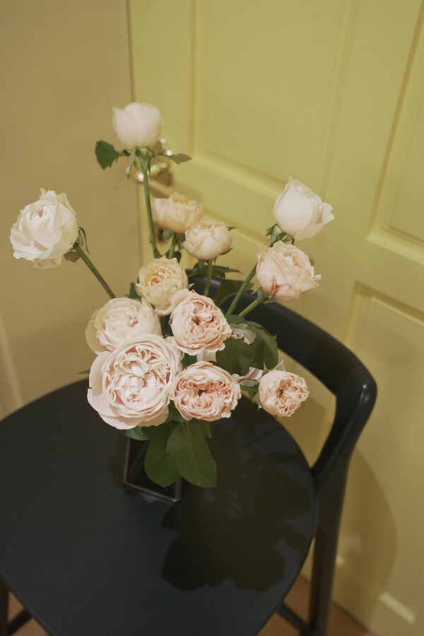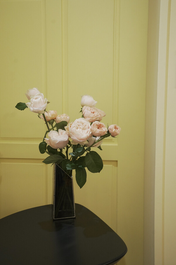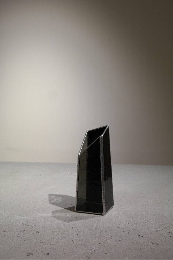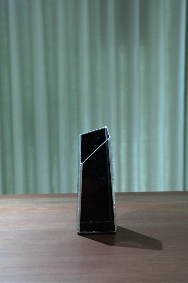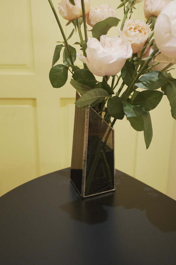 장미의 꽃잎이 겹쳐져 피어나기 시작하는 얼굴과, 장미의 가시를 기하학적으로 해석하여 비대칭 비율의 높이의 사각면들을 배치하여 디자인하였습니다. 높은 두 면의 불투명 검정색 유리와 낮은 두면의 투명 검정색 유리가 겹쳐져 장미의 줄기가 비치는 모습이 화병의 선적인 요소를 더욱 극대화합니다. 모던하고 쉬크한 인테리어를 선호하시는 분들에게 추천드리는 디자인으로 여러종류의 꽃을 섞어 담았을 때에도 멋스러운 매력을 뽐내는 화병입니다.