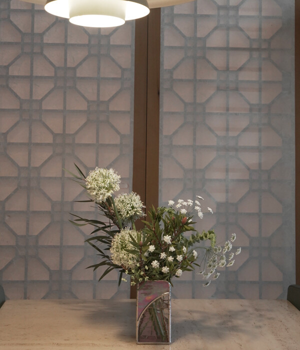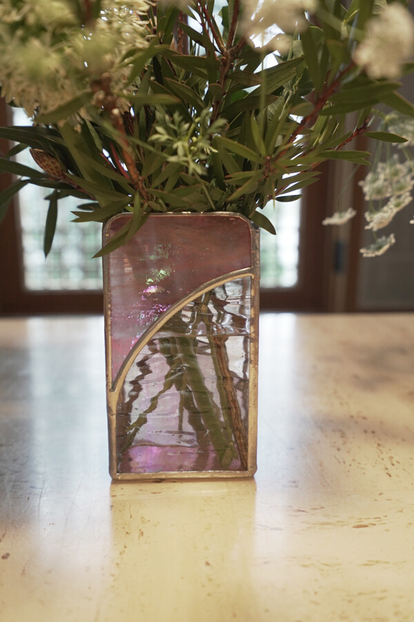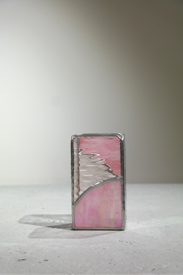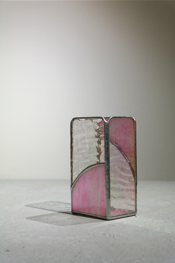 전체 화병 디자인에서 각도를 달리하며 선보인 곡선의 패턴을 응용하여 디자인한 화병입니다. 펄감이 도는 반투명 분홍색 유리와 가로 방향으로 투명 물결 유리를 교차로 배치하여 드라마틱한 곡선을 즐길 수 있습니다. 펄감이 도는 투명 유리를 측면에 배치하여 바라보는 각도에 따라 다양한 반짝임을 선물하는 사랑스러운 화병입니다.