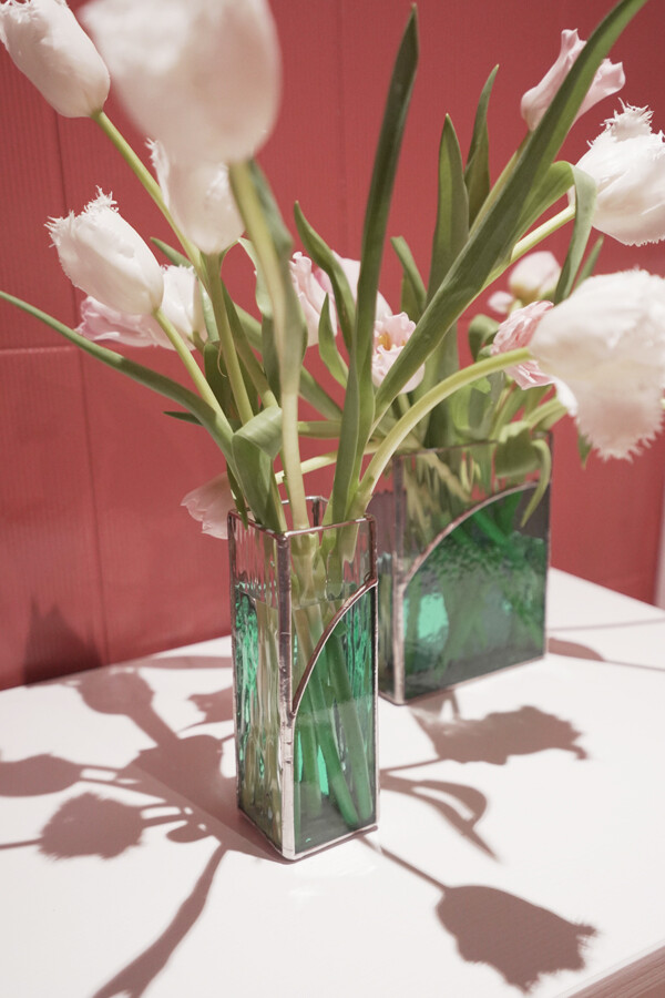 다양한 색깔의 튤립을 담았을 때의 모습을 연상하며 부드러운 초록색 곡선의 잎 사이에 튤립의 꽃잎이 겹쳐져 있는 봉오리를 패턴화 하고, 두가지의 다른 그린 톤의 글라스가 겹쳐졌을때 또 다른 초록을 즐길 수 있는 디자인한 화병입니다. 물결무늬 패턴의 투명유리를 측면과 패턴의 여백으로 활용하여 신비로운 분위기를 줍니다. 2-3송이를 담기 좋은 크기와, 튤립 한단을 담았을때 활용하기 좋은 크기로 구성하였습니다.